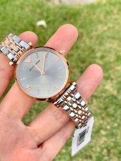 Montre Femme Emporio Armani Gianni T-bar AR1725 Bicolore Or Rose Cadran Gris 32mm