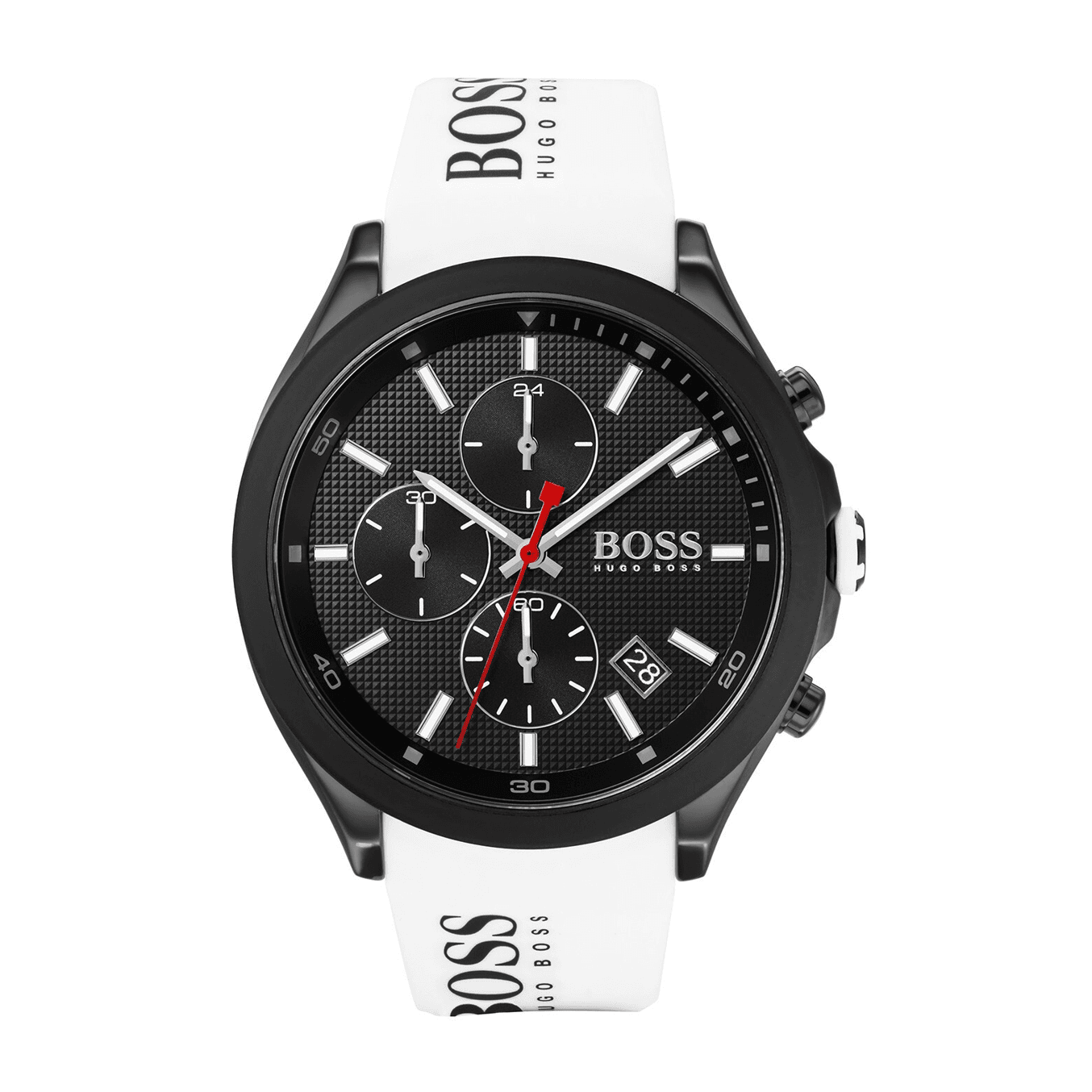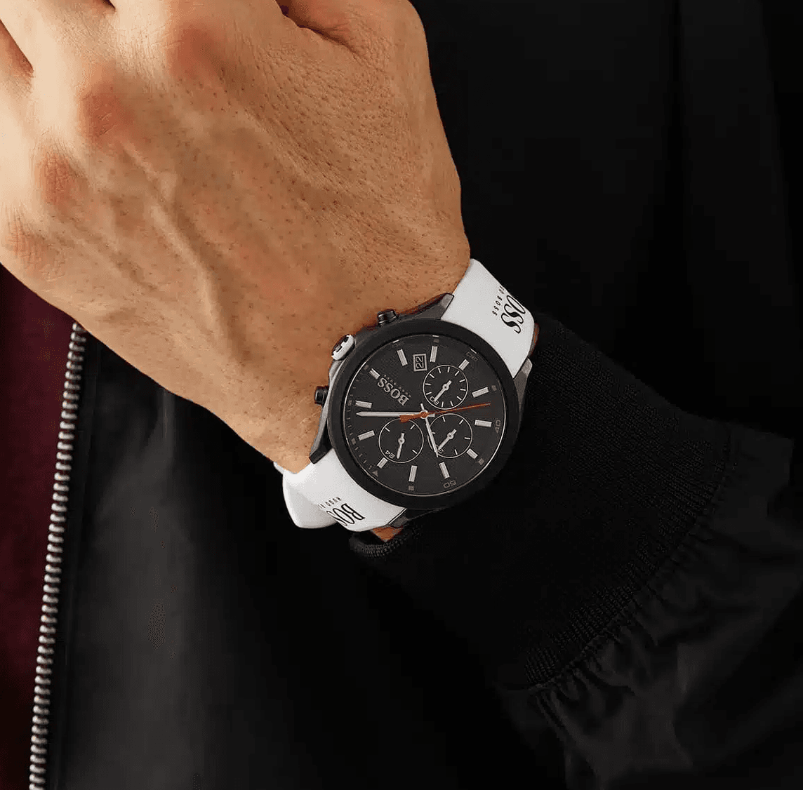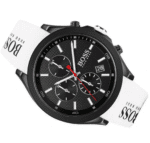 Ce noir profond est tranché par le blanc éclatant du bracelet en silicone. C’est le cœur du design de cette montre homme noir et blanc. Le bracelet n’est pas seulement blanc ; il est fièrement logoté « BOSS HUGO BOSS », une signature de mode audacieuse.