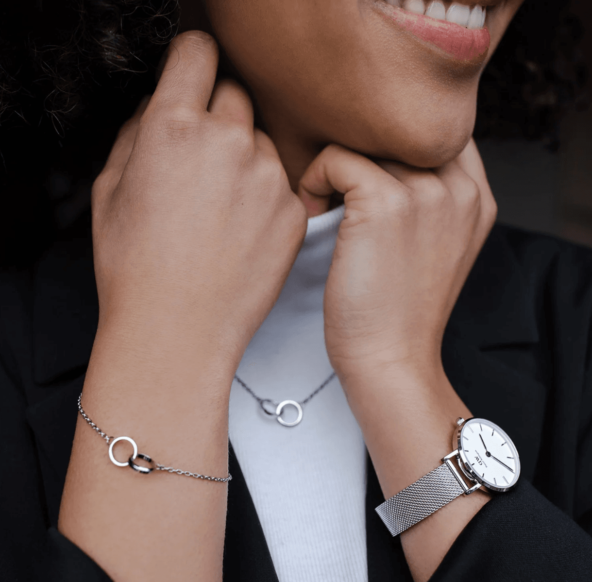 Le bracelet mesh argent apporte une esthétique métallique moderne, sophistiquée, froide et urbaine qui se distingue de la chaleur organique classique du cuir marron ou noir. Cette approche contemporaine nordique séduit les femmes qui apprécient le design minimaliste moderne, l’architecture métallique et les accessoires bijoux raffinés en argent sterling. Le mesh argent évoque les bracelets joncs argentés, les bangles et les bijoux en argent 925 qui ornent traditionnellement les poignets féminins, créant une harmonie stylistique entre montre et parure argentée coordonnée.