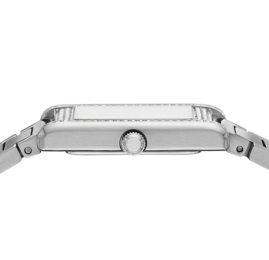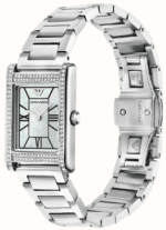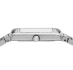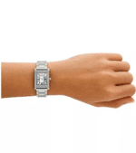 Le boîtier rectangulaire est sublimé par une lunette entièrement sertie d’une double rangée de cristaux scintillants. C’est une montre femme cristaux argentée qui capte la lumière sans être ostentatoire, parfaite pour une soirée chic à Casablanca ou un événement à Rabat.