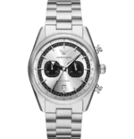 La montre Emporio Armani AR11636 s’inspire de l’univers des courses automobiles avec son look « panda » bicolore argenté et noir. Le cadran argenté à finition sunray capte la lumière et crée des reflets subtils qui ajoutent de la profondeur au design. Les deux sous-compteurs noirs circulaires rappellent les instruments de bord d’une voiture de sport, tandis que l’échelle tachymétrique gravée sur le pourtour du cadran renforce l’esprit racing de ce modèle.