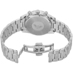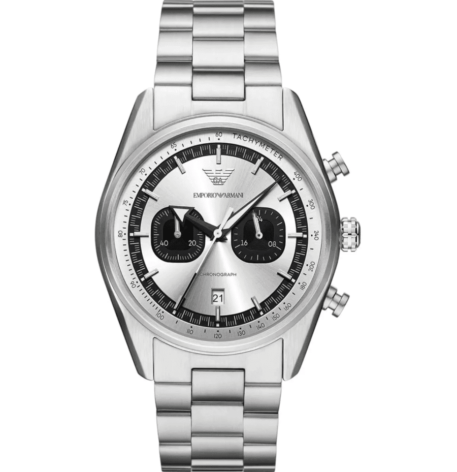 Le logo Emporio Armani ailé trône à 12 heures, signature discrète mais immédiatement reconnaissable de la marque. Les index appliqués en bâtonnets et les aiguilles luminescentes assurent une lisibilité optimale de jour comme de nuit. Cette montre chronographe combine ainsi esthétique racée et fonctionnalité au service d’un style affirmé.