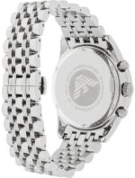 Le boîtier rond en acier inoxydable argenté mesure 46 mm de diamètre. Il abrite un mouvement chronographe à quartz avec affichage de la date. Le bracelet en acier est sécurisé par une boucle déployante. La montre est étanche jusqu’à 5 ATM.