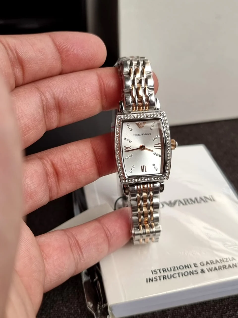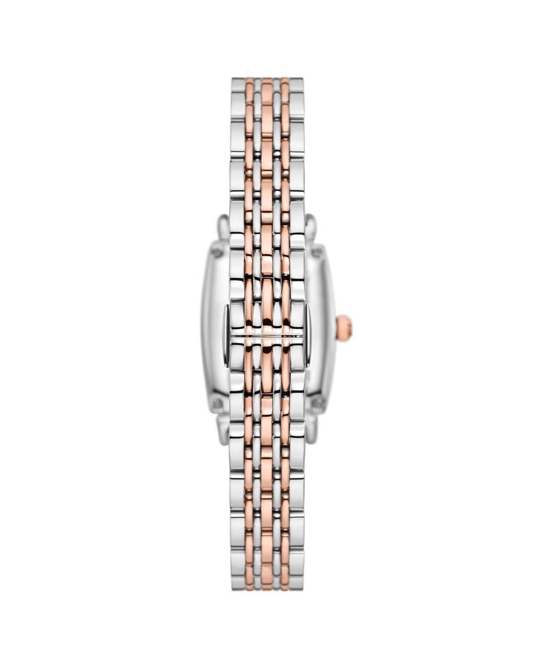 La montre femme bicolore or rose est une tendance forte au Maroc, mais Armani la rend intemporelle avec ce design équilibré. C’est un excellent choix si vous cherchez une montre femme rectangulaire or rose avec une touche d’argenté.