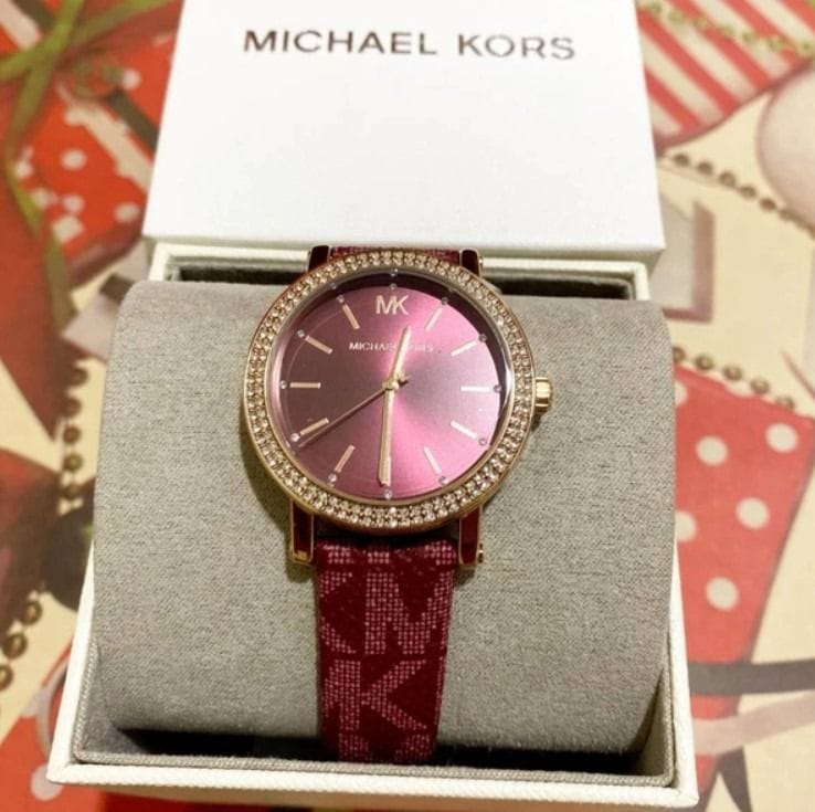 R3 : Oui, il s’agit d’un bracelet en cuir véritable de couleur rouge bordeaux, embossé avec le motif logo MK signature de la marque. C’est une montre femme cuir rouge de haute qualité.