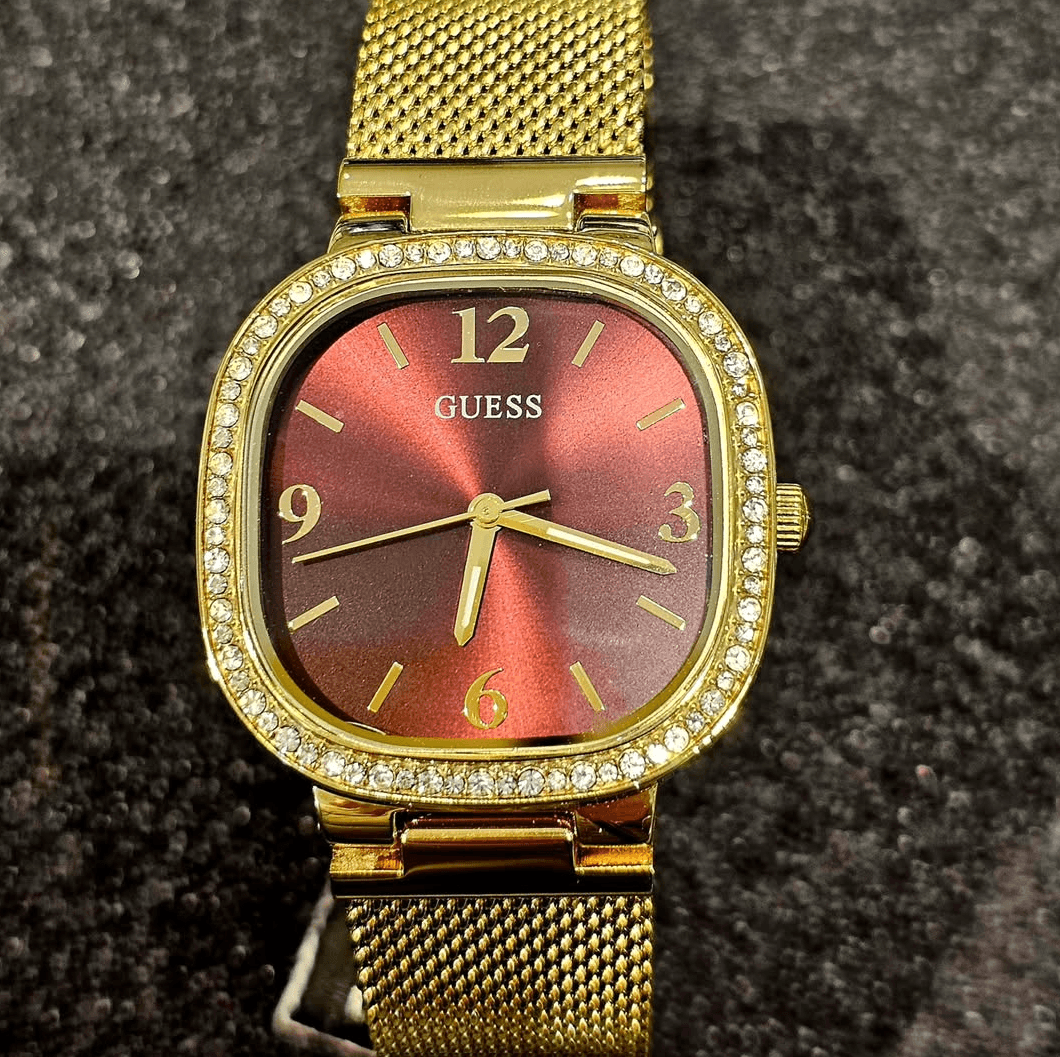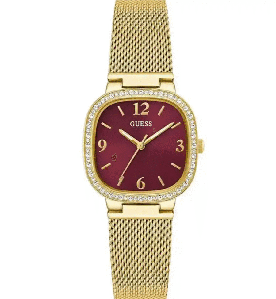 Le premier détail qui captive sur la référence GW0354L4, c’est son cadran. Guess a choisi un rouge bordeaux profond (Burgundy), une couleur synonyme de passion, de luxe et de chaleur. Cette teinte riche contraste magnifiquement avec le boîtier en acier inoxydable finition Dorée (Gold Tone).