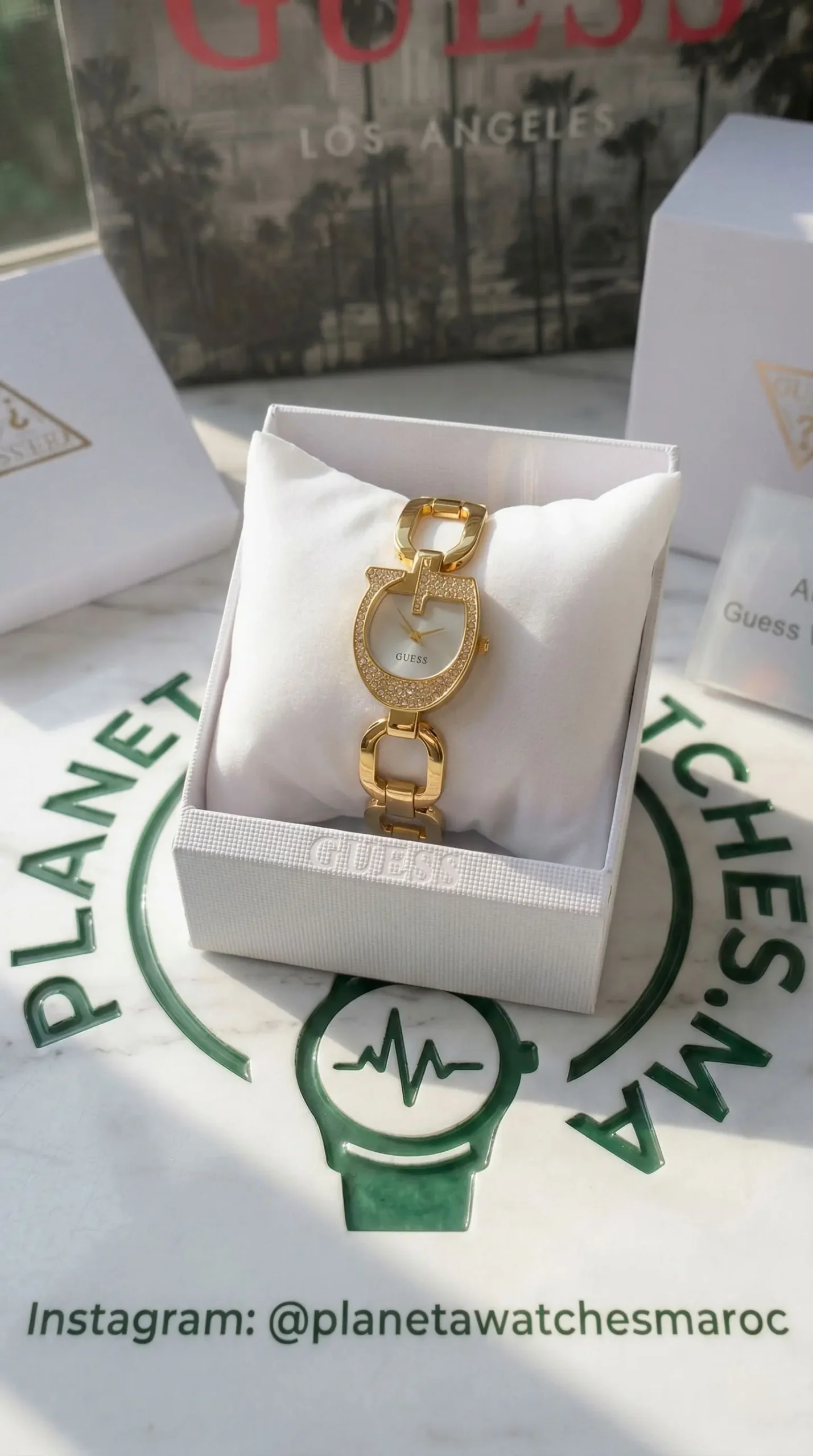 Le design de cette montre casse volontairement les codes traditionnels. Son boîtier en acier inoxydable doré est sculpté en forme de « G » majuscule, une référence fière et luxueuse à la marque GUESS.