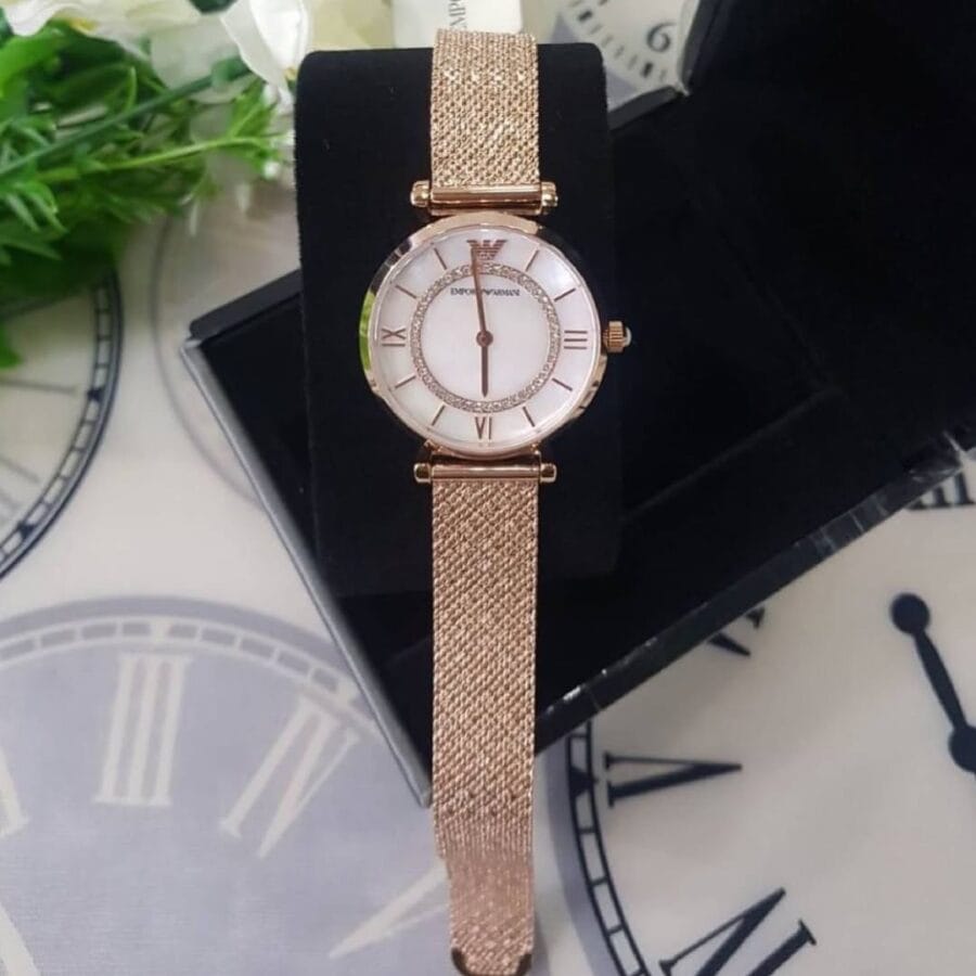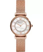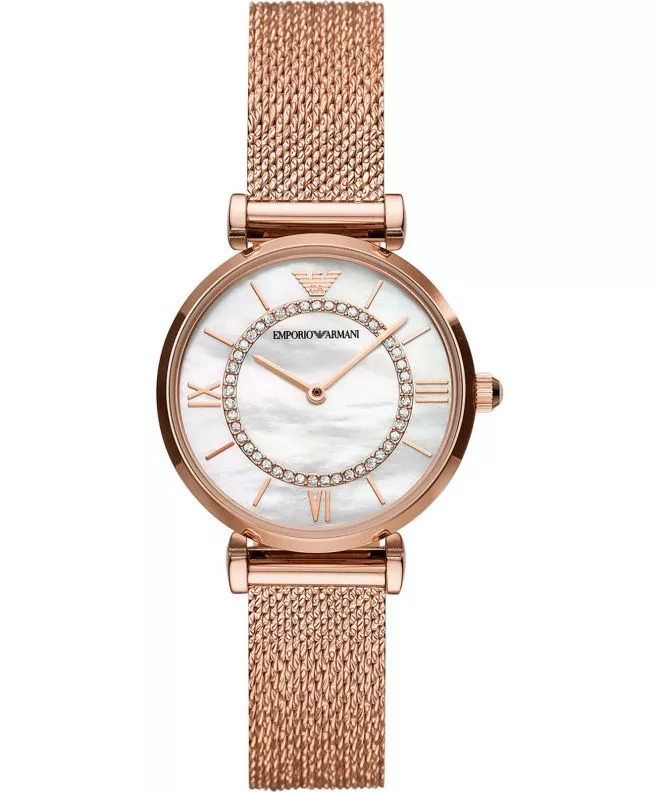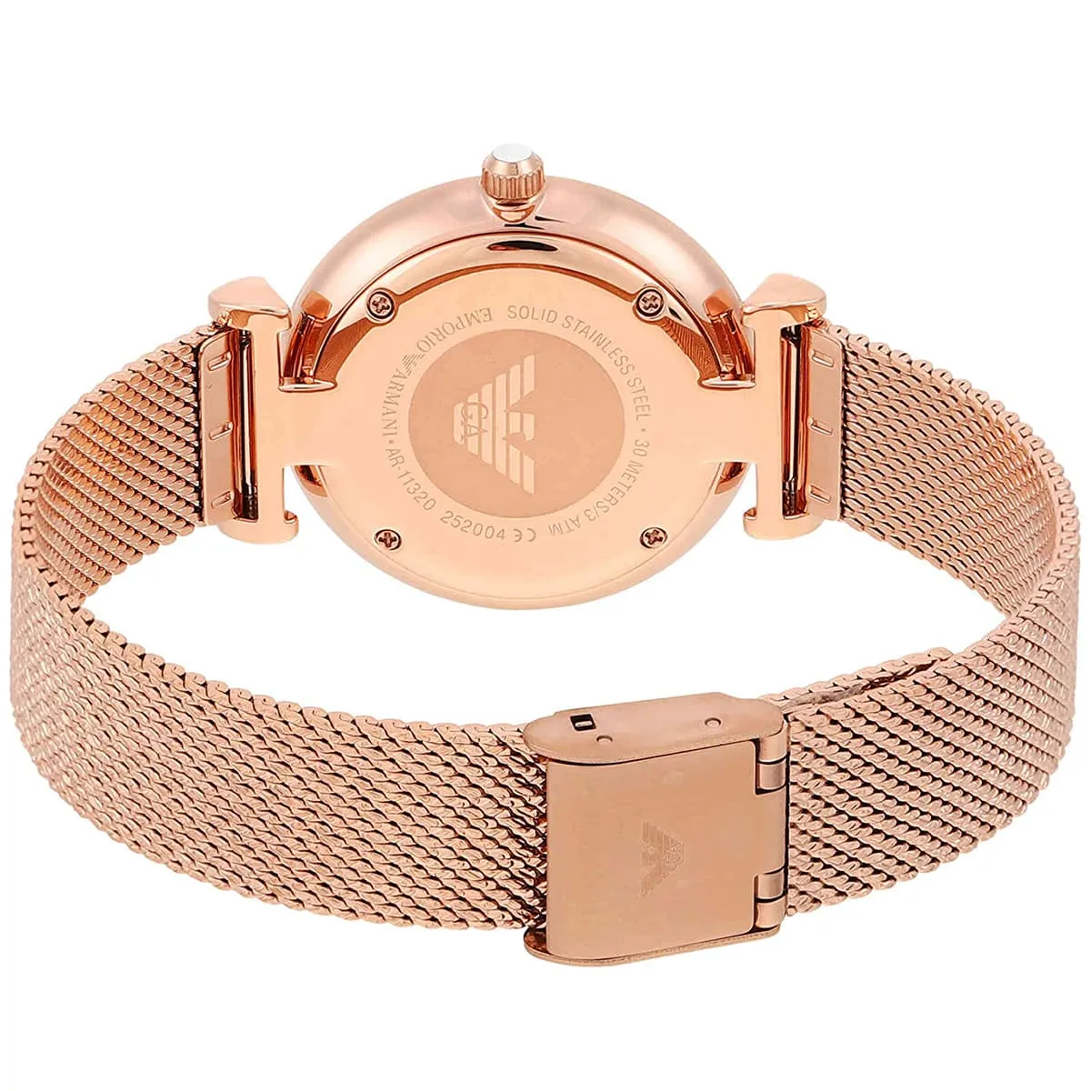 Contrairement aux modèles bicolores, la AR11320 assume pleinement la tendance or rose. Le boîtier et le bracelet milanais sont entièrement recouverts d’un placage PVD or rose de haute qualité.