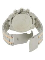 - Le Bracelet Bicolore : Le bracelet en acier inoxydable de la Montre Guess Deck W0522G4 reprend le jeu de couleurs du boîtier. Il alterne des maillons extérieurs en acier argenté brossé avec des maillons centraux polis en PVD or rose, créant un look bicolore à la fois sportif et élégant.