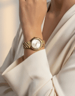 Son design général, avec le bracelet qui semble se fondre dans le boîtier, crée une silhouette élégante et harmonieuse. C’est une montre femme dorée chic.