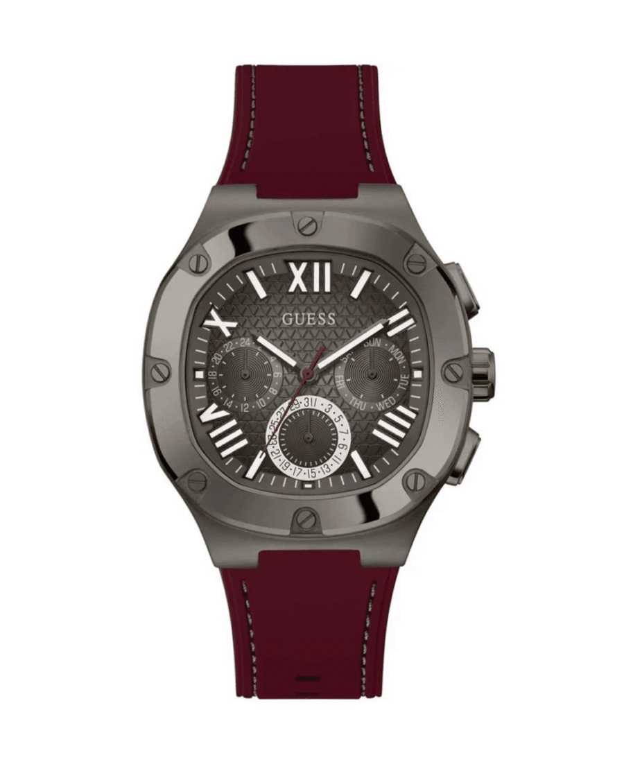 Le véritable coup d’éclat de la Montre Guess GW0571G4 est son bracelet. Réalisé en silicone bordeaux, il crée un contraste audacieux et très tendance avec le boîtier gris anthracite. Cette couleur riche et profonde apporte une touche de chaleur et d’originalité inattendue. Le silicone est également un choix de confort : léger, souple, résistant à l’eau et à la transpiration, c’est le matériau idéal pour un style de vie actif. Sa texture lisse et sa surpiqûre ton sur ton ajoutent une finition soignée.