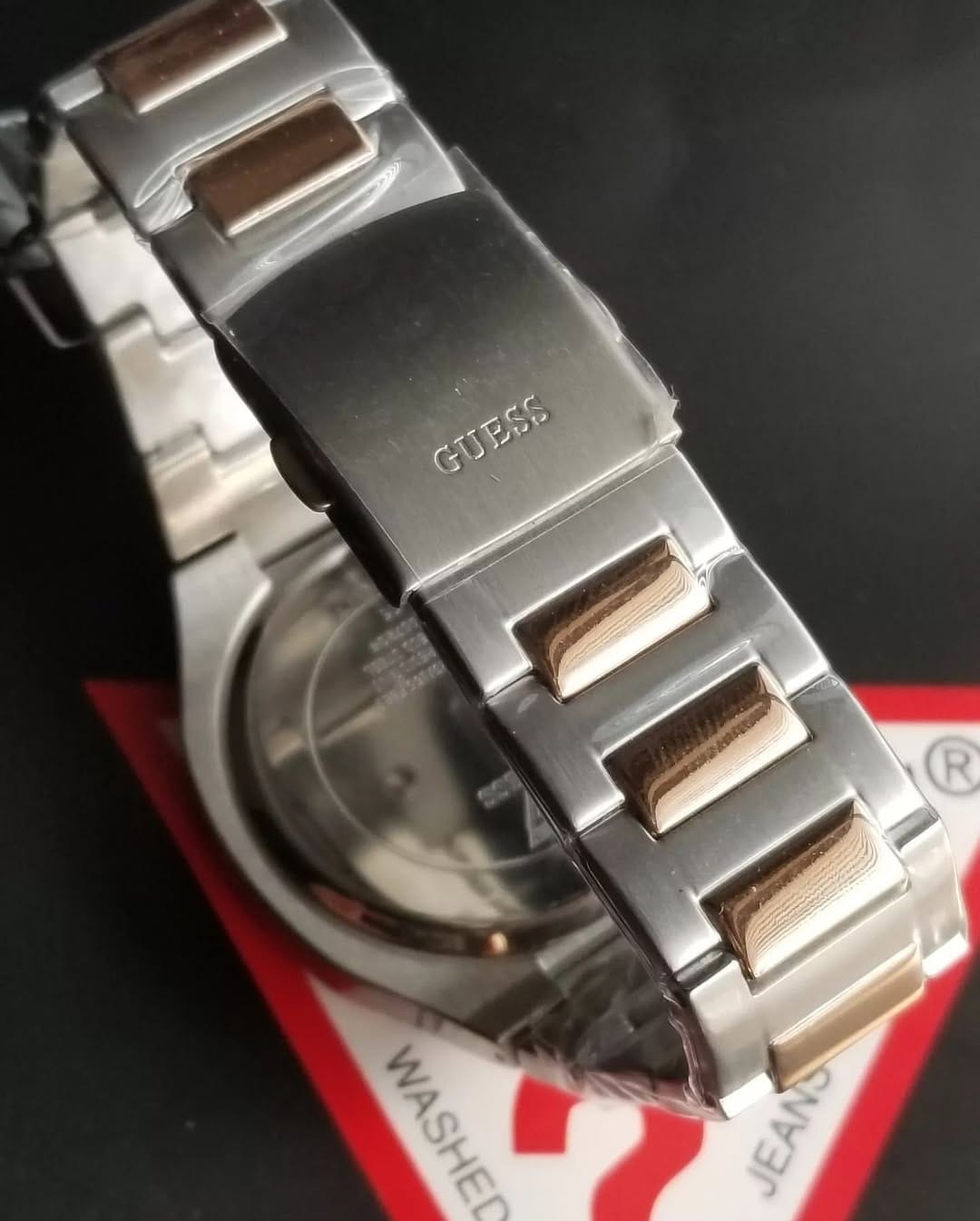 Le bracelet de la Montre Guess GW0572G4 poursuit le jeu de couleurs du boîtier. Les maillons extérieurs en acier inoxydable argenté encadrent des maillons centraux plaqués or rose. Ce bracelet robuste et confortable est doté d’une boucle déployante pour un maintien parfait. Il complète l’allure sport-luxe de la montre avec une grande cohérence. Ce montre homme à bracelet acier bicolore est à la fois durable et élégant.
