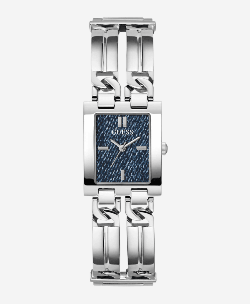 Montre Femme GUESS GW0807L1 : Boîtier Rectangulaire Argenté et Cadran Denim Bleu