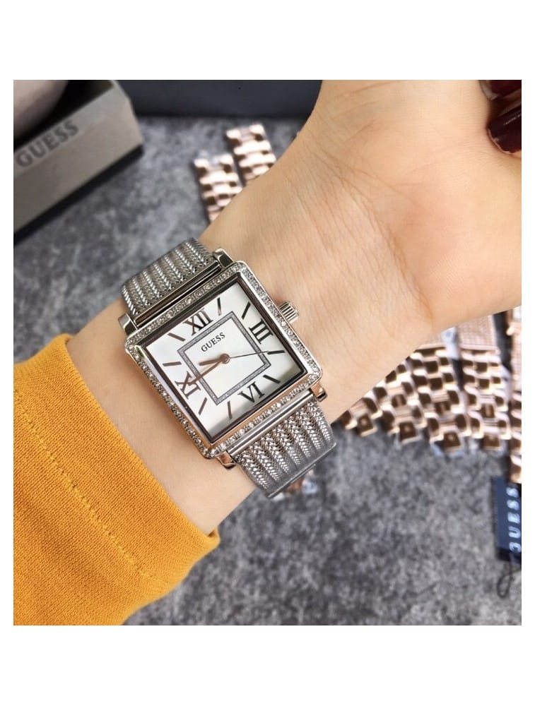 Autour du boîtier, une lunette sertie de petits cristaux brillants attire subtilement la lumière. Ces détails ne sont pas là par hasard : ils incarnent le luxe discret à la manière Guess. L’éclat des cristaux complète à merveille le ton argenté du cadran et du bracelet, créant une harmonie visuelle parfaite.
