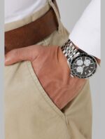 - Le Cadran Multifonction Lisible : Le cadran noir est conçu pour une lisibilité maximale. Il est orné d’index audacieux et d’aiguilles larges, tous traités avec une matière luminescente pour une visibilité parfaite dans l’obscurité. Les trois compteurs affichent le jour de la semaine, la date du mois et l’heure au format 24 heures, vous donnant toutes les informations essentielles d’un seul coup d’œil.