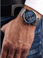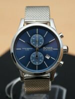 Les index et aiguilles en acier poli ajoutent une touche moderne, tout en conservant l’élégance classique chère à Hugo Boss. Le logo « BOSS » trône fièrement à 3h, affirmant l’ADN haut de gamme de la montre.