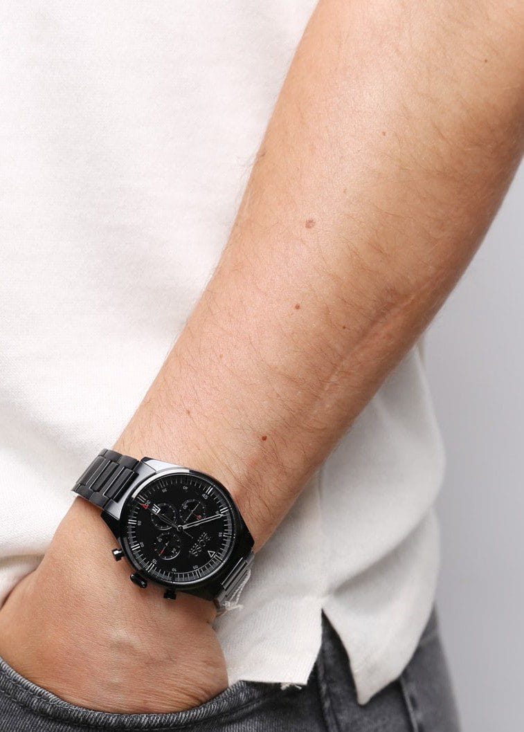 Le cadran noir épuré, agrémenté de sous-cadrans chronographes et d’aiguilles argentées lumineuses, assure une lisibilité optimale de jour comme de nuit. Le verre minéral trempé protège le cadran contre les rayures et les chocs, tout en conservant une clarté exceptionnelle. Ce modèle est l’exemple parfait d’une montre qui combine robustesse et finesse esthétique.