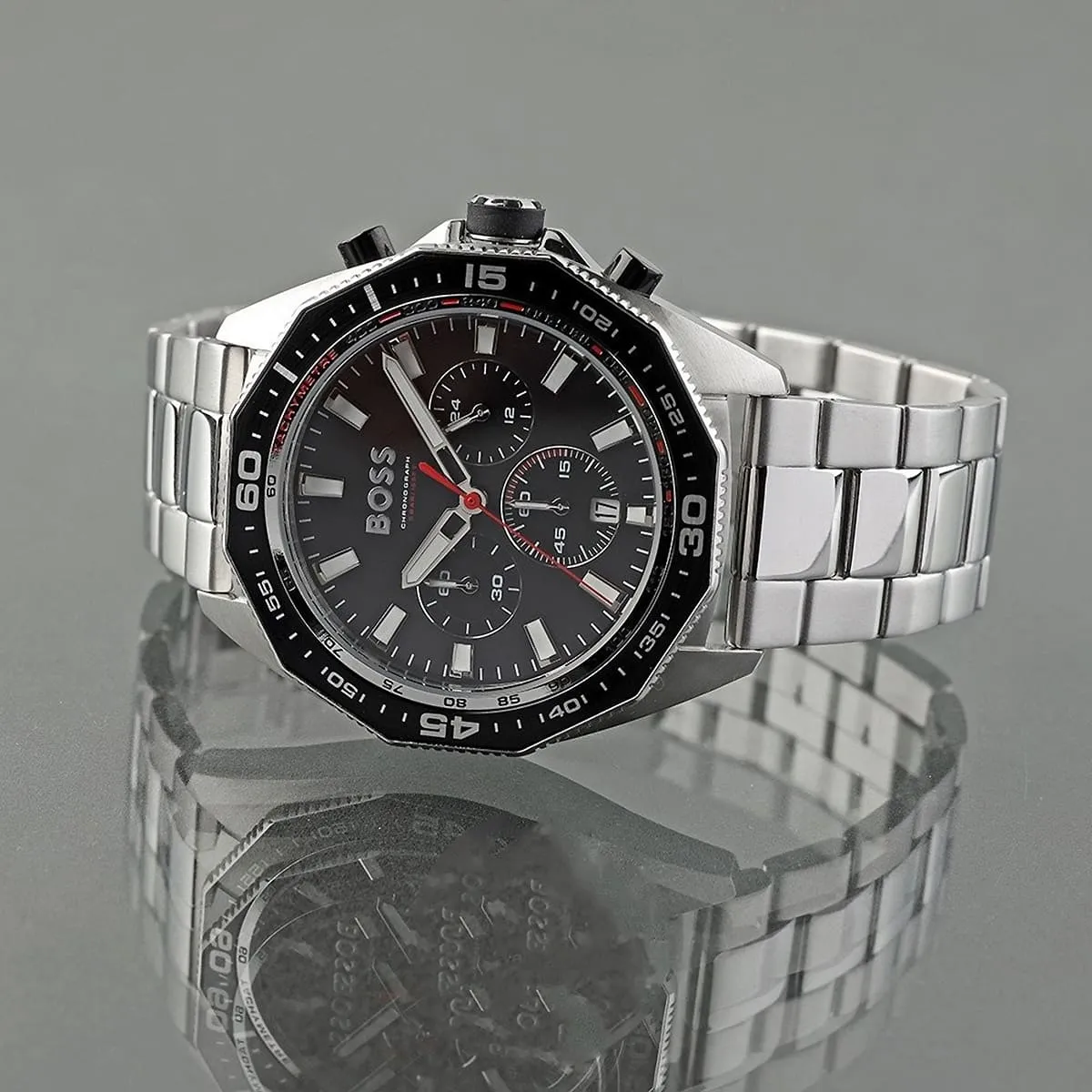 Le design de la Montre Hugo Boss 1513971 est pensé pour les hommes qui veulent affirmer leur style avec confiance. Son large boîtier de 44 mm en acier inoxydable offre un rendu robuste sans être excessif. Le cadran noir, orné d’aiguilles et d’index argentés lumineux, contraste subtilement avec le boîtier et le bracelet argenté, créant un look à la fois sophistiqué et sportif.