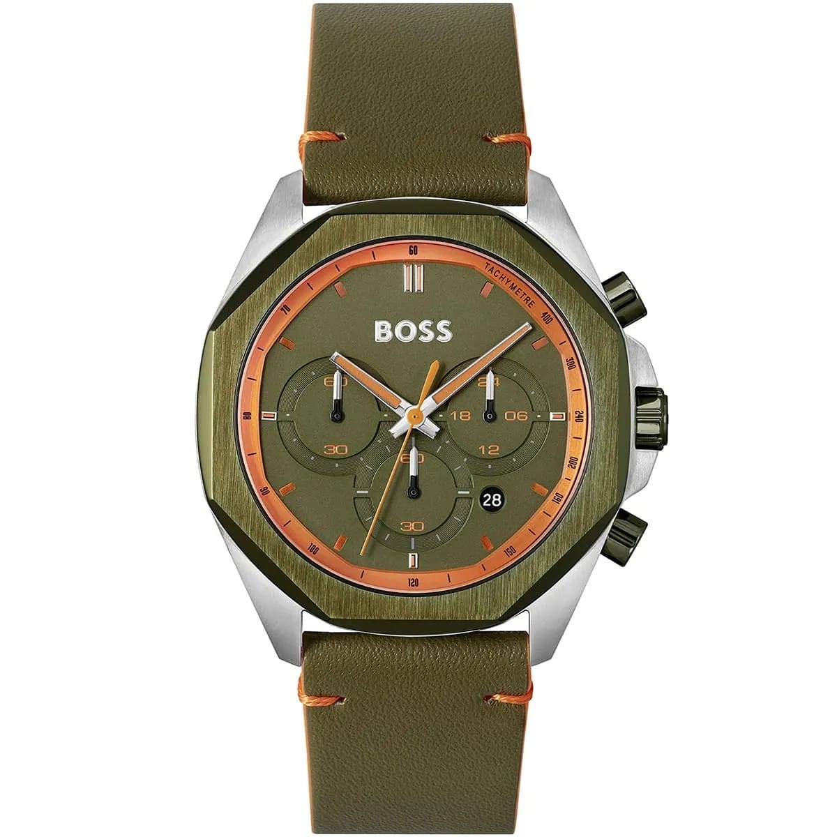 Ce chronographe vert et orange est une pièce maîtresse pour les looks décontractés et urbains.