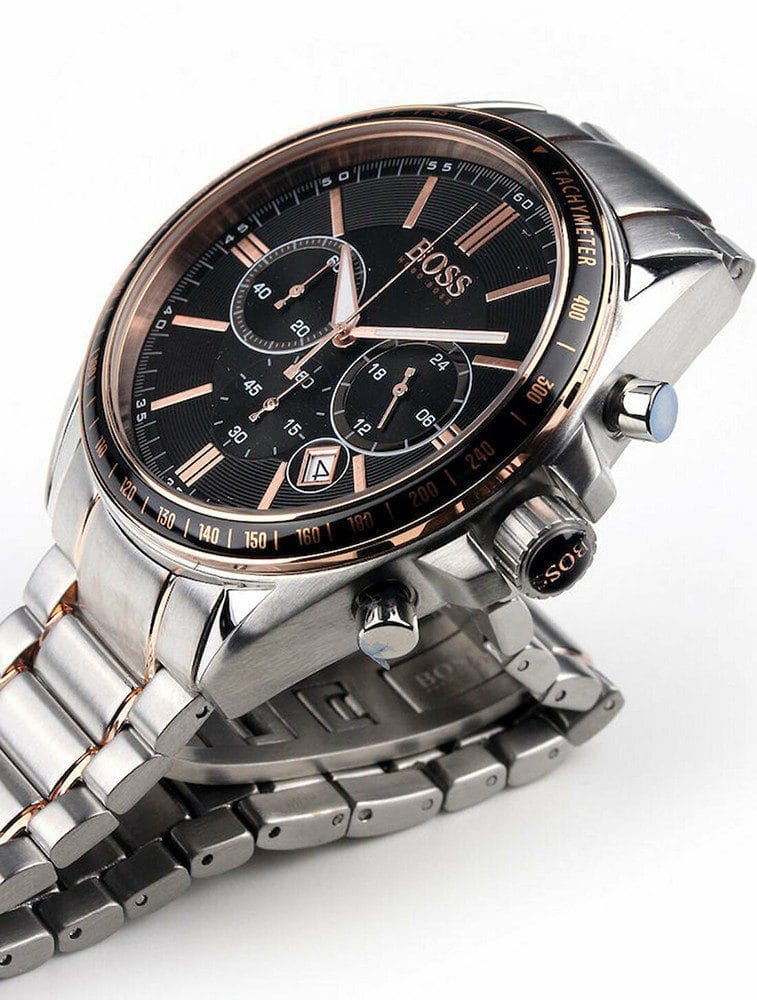 - La Lunette Tachymétrique : La lunette fixe en PVD noir est gravée d’une échelle tachymétrique en or rose. Cette fonction, essentielle sur un chronographe de course, permet de mesurer une vitesse moyenne sur une distance donnée. C’est un détail qui ancre fermement la Montre Hugo Boss Grand Prix 1513094 dans son héritage sportif.