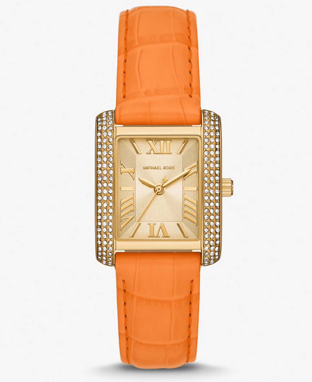 Largeur de 18 mm, coutures impeccables et fermoir ardillon en acier doré gravé Michael Kors : chaque détail confirme le positionnement premium de cette référence. Le contraste entre le cuir orange soleil et l’or jaune poli est une alliance chromatique forte, idéale pour une femme qui assume son style.