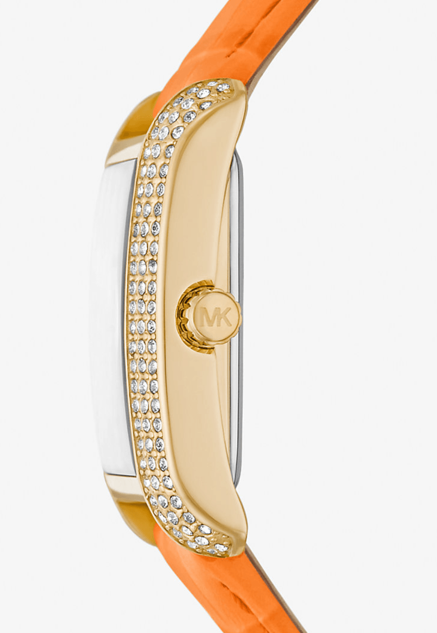 C’est le bracelet en cuir véritable orange vif à embossage crocodile qui fait toute la singularité de la MK2983. Ce coloris audacieux, porté par les tendances mode actuelles, transforme une montre classique en véritable statement piece.