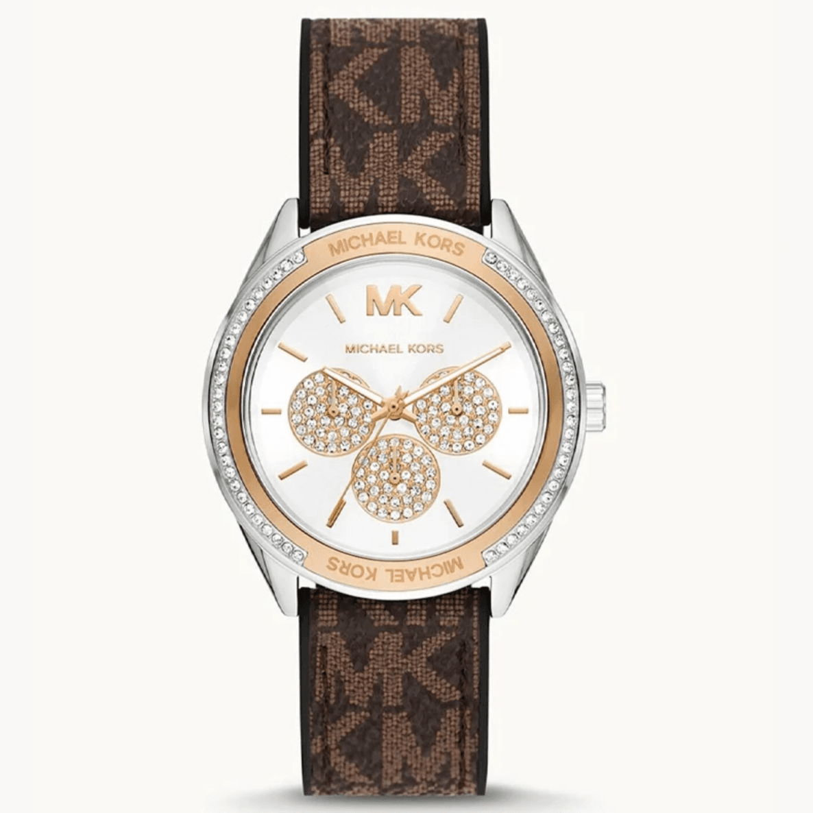 Pour parfaire ce design audacieux, la montre est montée sur un bracelet en Silicone de haute qualité, arborant le célèbre imprimé logo « MK » dans des tons marron. Ce motif signature, reconnaissable au premier coup d’œil, ancre définitivement ce modèle dans l’univers de la mode de luxe.