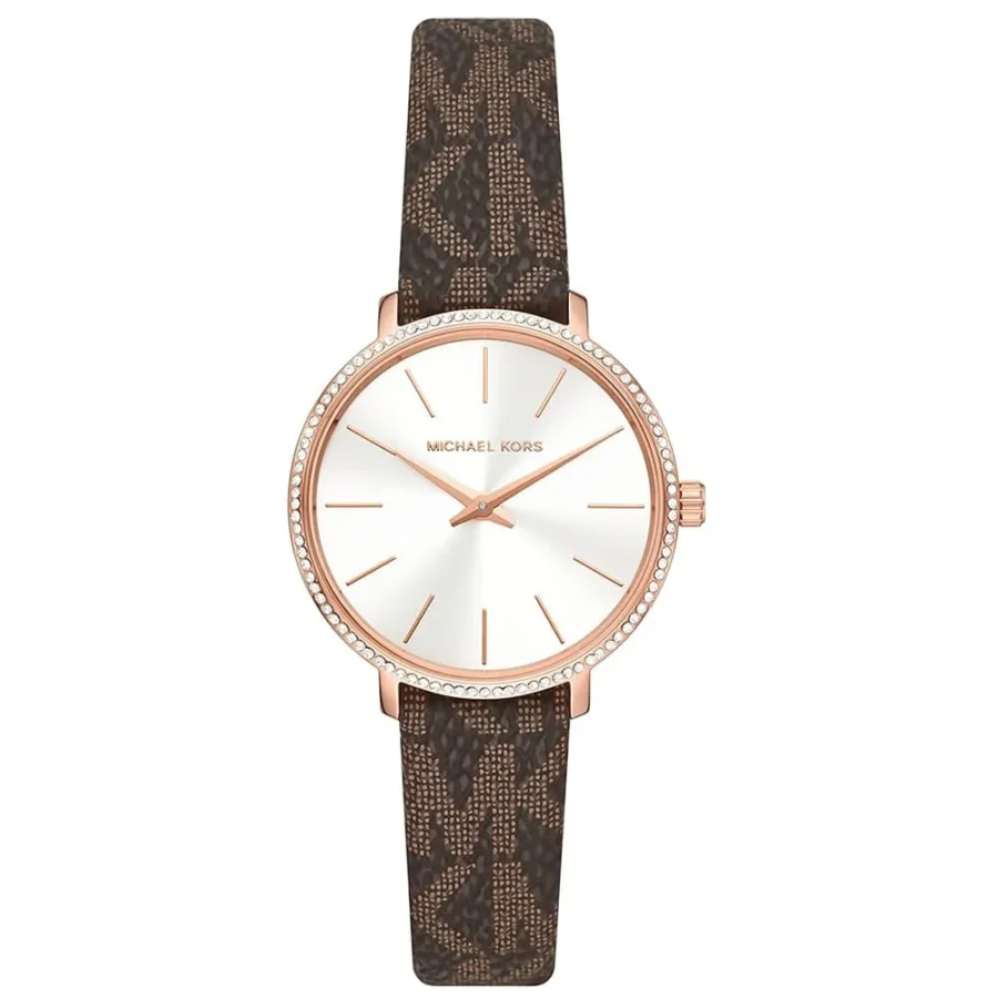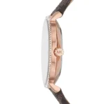 La finition or rose du boîtier et de la boucle crée une harmonie parfaite avec les tons chauds du bracelet marron et les reflets dorés du cadran blanc. Les index bâtons et les aiguilles en or rose garantissent une lisibilité optimale tout en maintenant l’esthétique raffinée qui caractérise les créations Michael Kors .