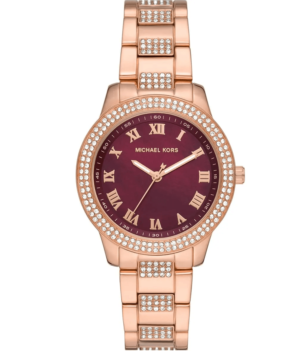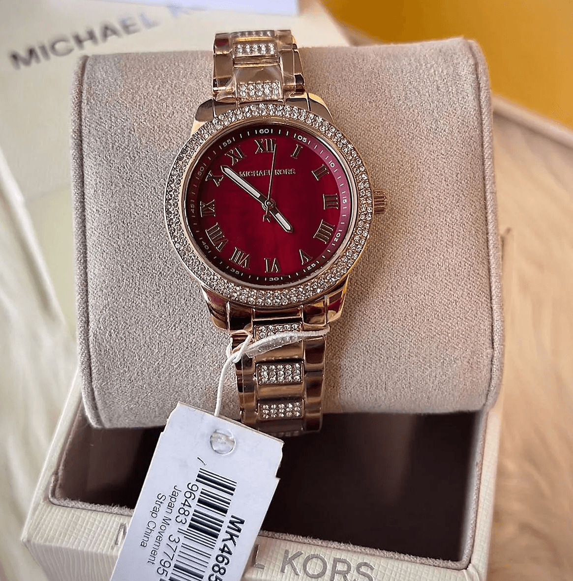 La Montre Michael Kors MK4685 Tibby est une pièce d’horlogerie qui incarne le glamour et la féminité précieuse. Conçue pour la femme qui aime les accessoires qui brillent et qui racontent une histoire de luxe, cette montre de la collection « Tibby » est un véritable bijou. Son esthétique est définie par une combinaison de couleurs riche et audacieuse : la chaleur de l’or rose, la profondeur mystérieuse d’un cadran rouge nacre, et l’éclat infini des cristaux.