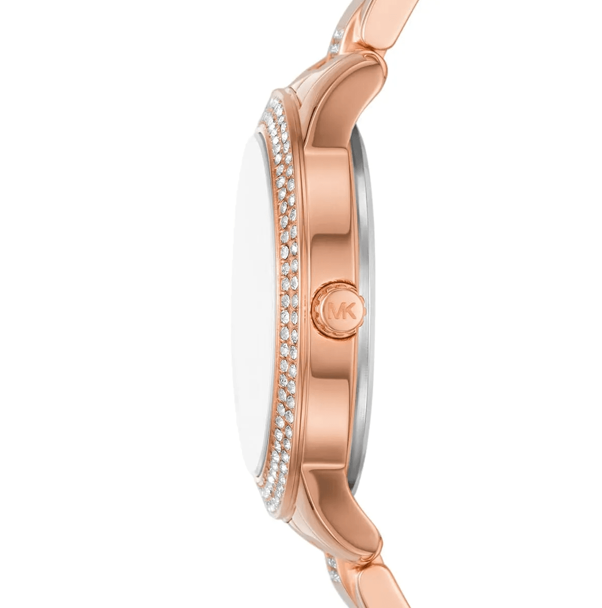 Le design de cette montre Michael Kors pour femme est une célébration de la lumière et des matériaux précieux, avec un focus sur deux éléments clés qui la rendent unique.