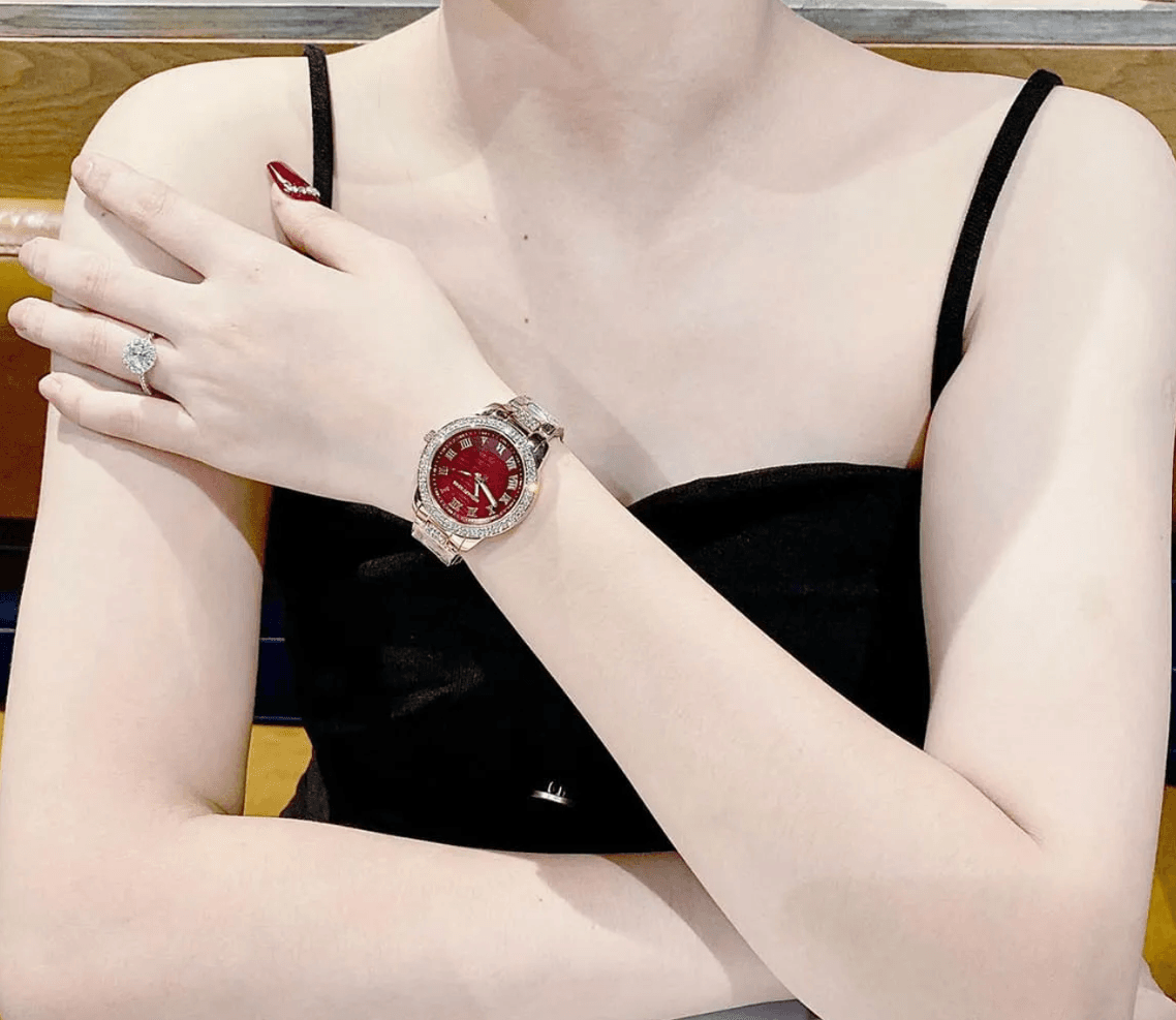 - Focus Couleur – Le Cadran Rouge Nacre : La pièce maîtresse de cette montre est son cadran en nacre rouge véritable. Cette couleur profonde, rare et envoûtante, change de nuance selon la lumière, passant du bordeaux au rubis. Elle offre un contraste magnifique et chaleureux avec le boîtier en or rose. Les chiffres romains ajoutent une touche classique à cette modernité colorée.