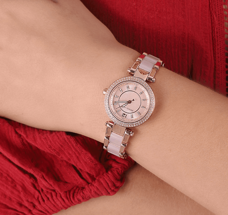 Le boîtier rond en acier inoxydable or rose mesure 33 mm de diamètre. Il abrite un mouvement à quartz à trois aiguilles de haute précision. Le bracelet est un mélange d’acier inoxydable or rose et de maillons en acétate rose. La montre est étanche jusqu’à 5 ATM.