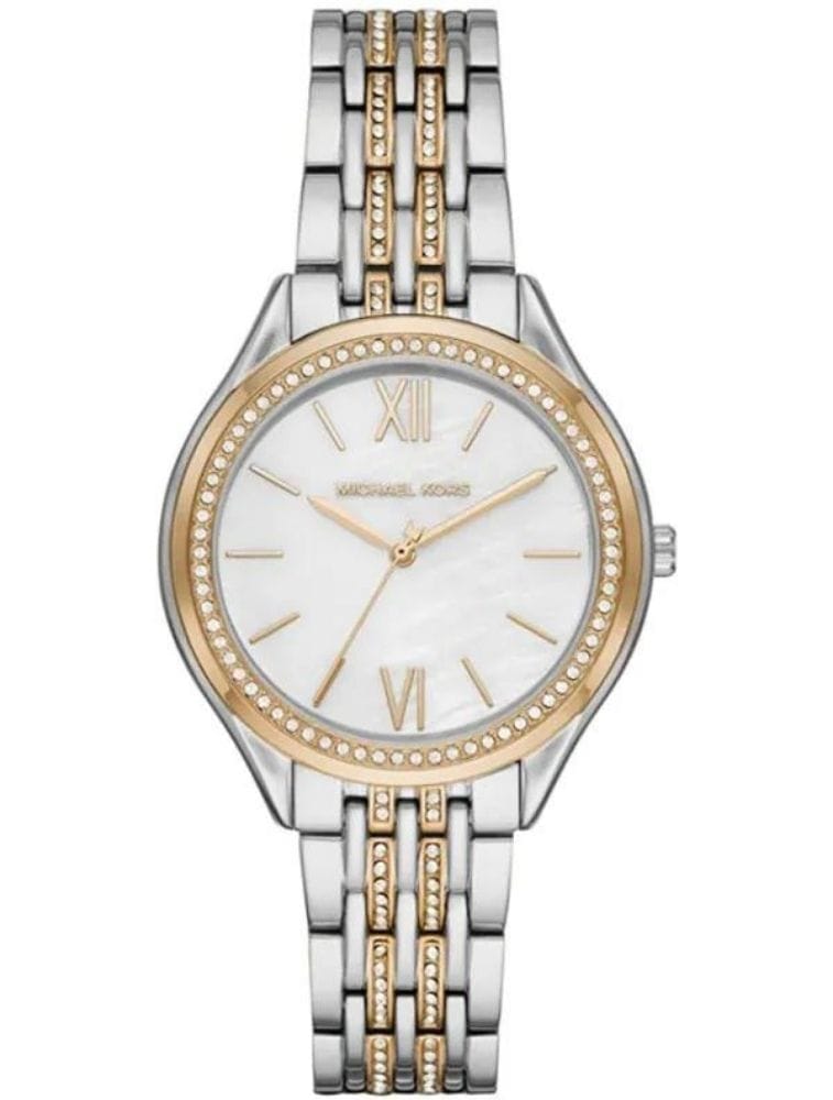 Pour un effet spectaculaire, les maillons centraux dorés sont entièrement sertis de cristaux pavés, transformant le bracelet en une rivière de lumière. La Montre Michael Kors MK7084 est conçue pour capter tous les regards.