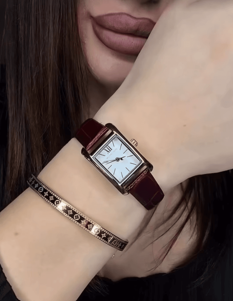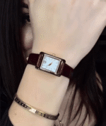 Pour les occasions spéciales comme les cocktails, les dîners élégants ou les événements culturels, cette montre accompagne parfaitement une robe de soirée dans les tons bordeaux, champagne, nude, crème ou noir. Le cadran blanc capte délicatement la lumière des bougies, créant un éclat discret mais remarqué. En look décontracté chic, portez-la avec un jean brut, une chemise blanche et des accessoires cuir bordeaux assortis (ceinture, sac) pour un style coordonné impeccable inspiré du chic parisien.