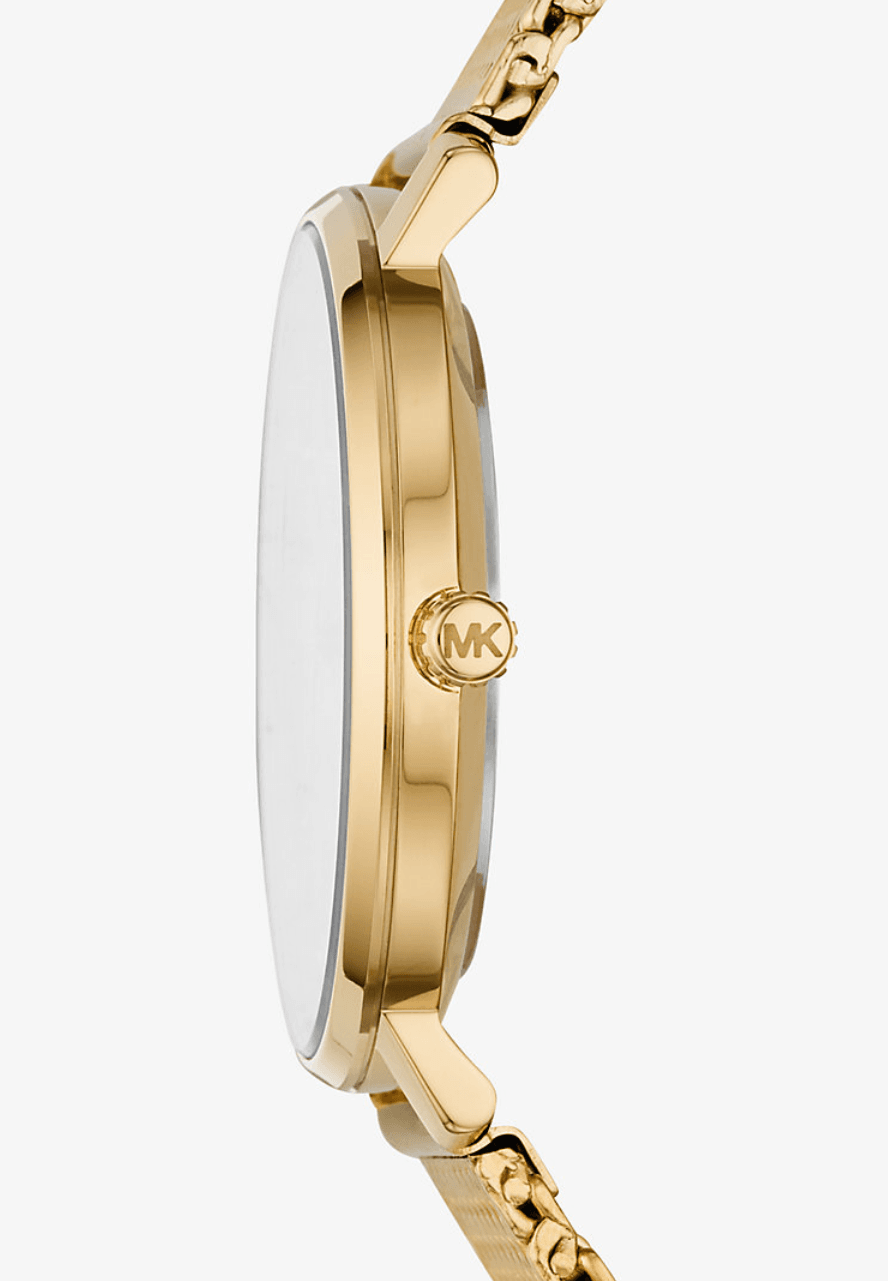 La montre Michael Kors Pyper MK4339 repose sur un boîtier rond de 38 mm en acier inoxydable doré (gold-tone), d’une épaisseur remarquablement contenue de 7 mm. Ce format mid-size s’impose comme le standard de l’élégance quotidienne dans la collection Pyper de Michael Kors.