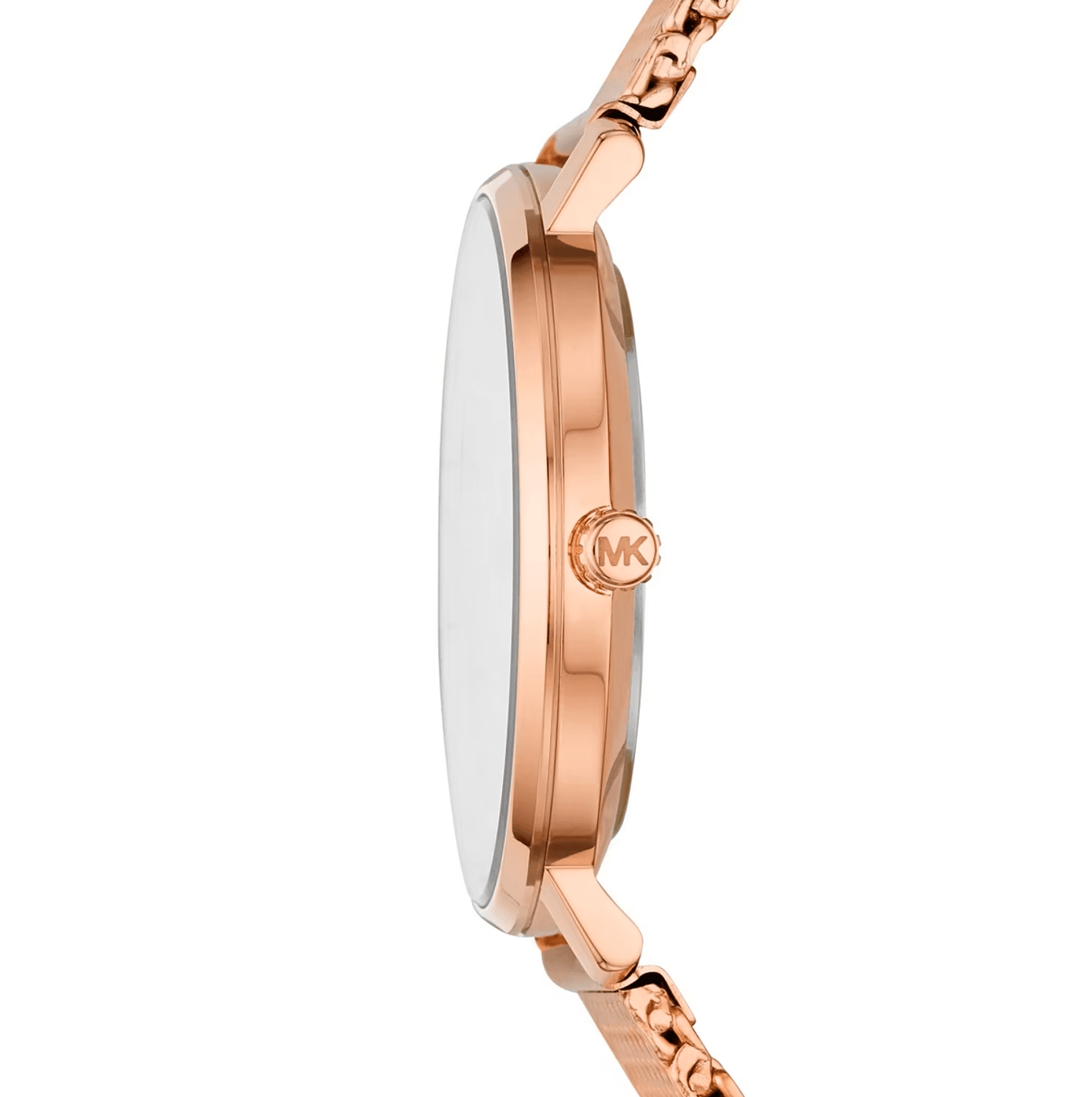 Le bracelet en maille milanaise acier plaqué or rose est la pièce maîtresse de la MK4340. Son tissage en double chevron croisé, intégralement teinté rose gold, crée une continuité visuelle parfaite entre le boîtier et le bracelet — un look monochrome total très recherché dans les tendances horlogères actuelles.