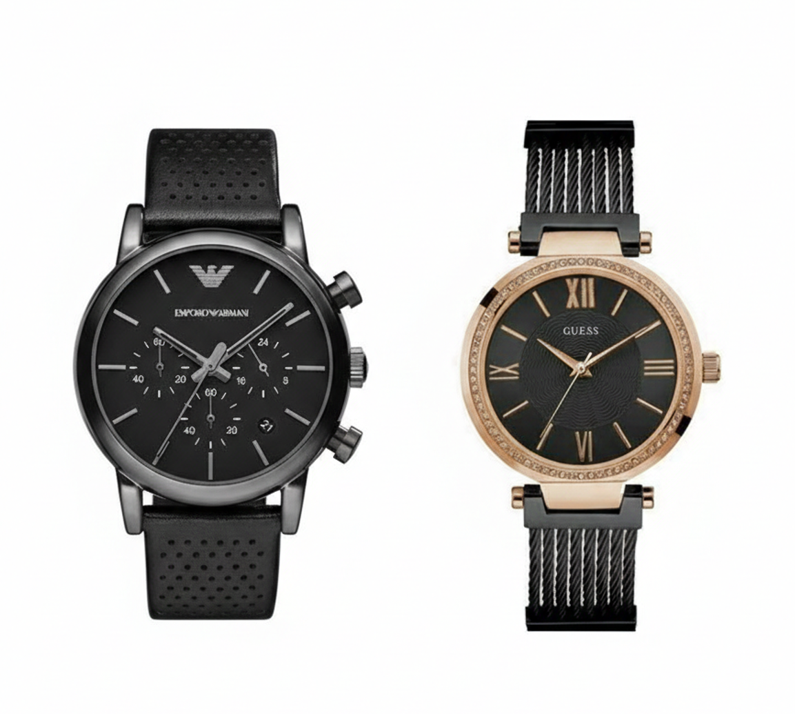 PlanetaWatches a créé le coffret « Dark Elegance ». Nous avons uni la puissance monochrome d’Emporio Armani au chic contrasté de Guess. Ce n’est pas un duo pour tout le monde, c’est un duo pour les couples qui maîtrisent leur style et qui aiment se démarquer.
