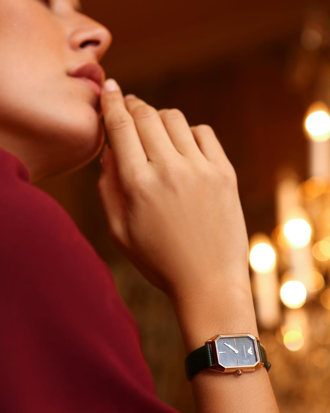 Cette montre femme vert n’est pas « flashy ». C’est une teinte de forêt, un vert émeraude foncé qui agit comme un nouveau noir : il est chic, facile à assortir et incroyablement raffiné.