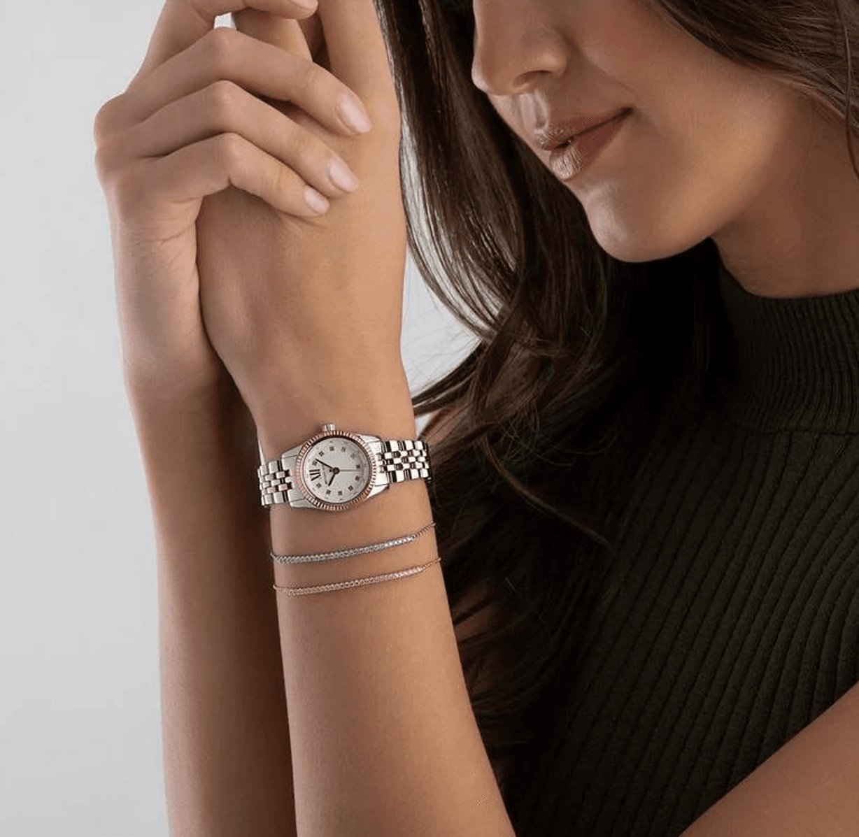 Cette pièce n’est pas juste une montre, c’est un bijou bicolore conçu pour la femme qui apprécie le luxe dans les moindres détails.